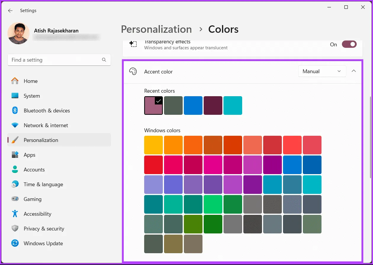 مرحله 3: به قسمت رنگ Accent بروید، روی نماد (پیکان) chevron کلیک کنید و از منوی کشویی Manual را انتخاب کنید..