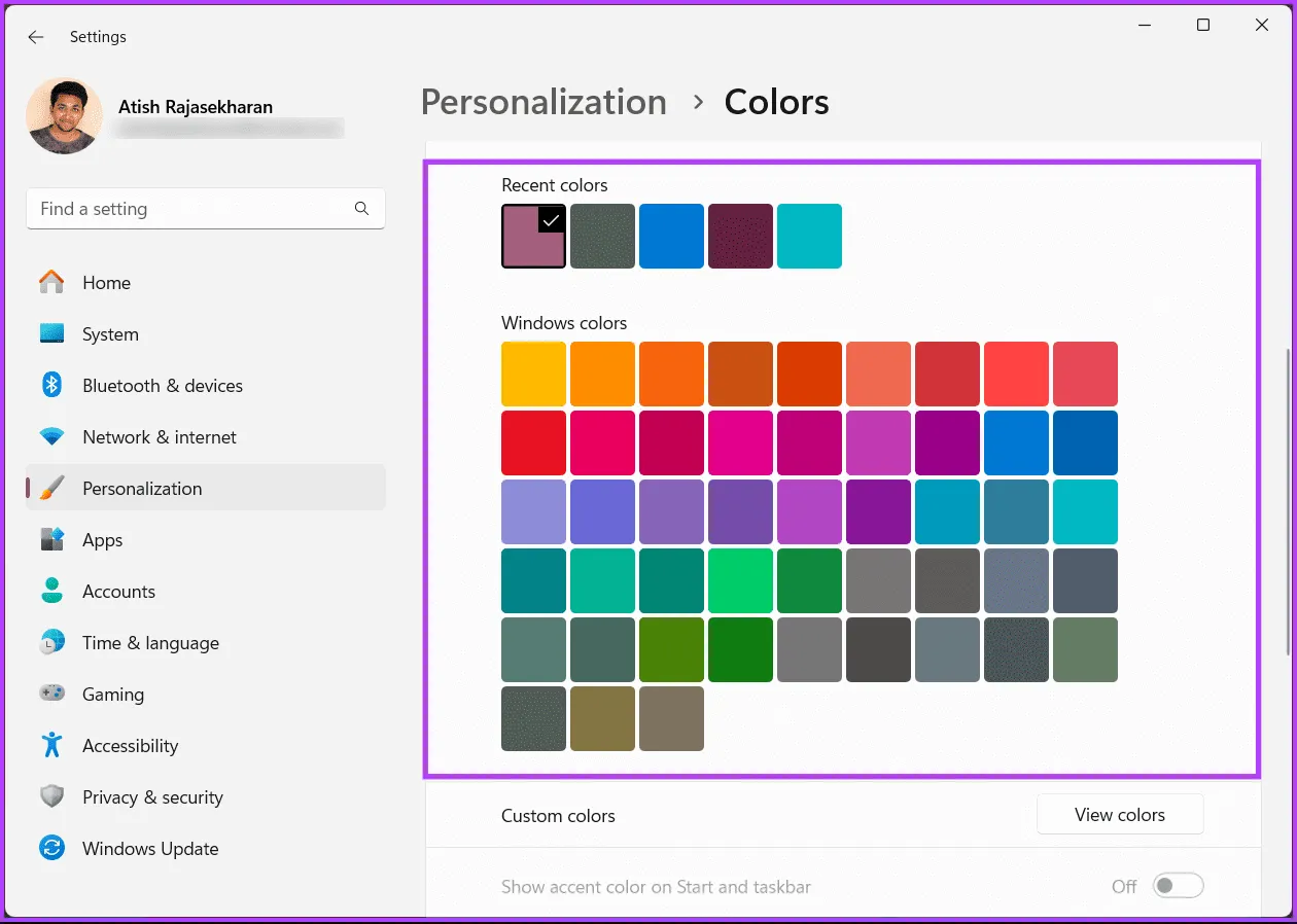 مرحله 5: اکنون به قسمت رنگ Accent بروید، رنگ مورد نظر خود را برای نوار وظیفه از شبکه انتخاب کنید و روی آن کلیک کنید..توجه: اگر هیچ رنگی را از شبکه نمیپسندید، کمی به پایین بروید، روی مشاهده رنگها کلیک کنید و رنگی را سفارشی انتخاب کنید..