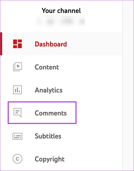 مرحله 1: YouTube Studio را در هر مرورگر وب باز کنید.استودیوی YouTube را باز کنید مرحله 2: در پانل کناری، روی نظرات کلیک کنید.