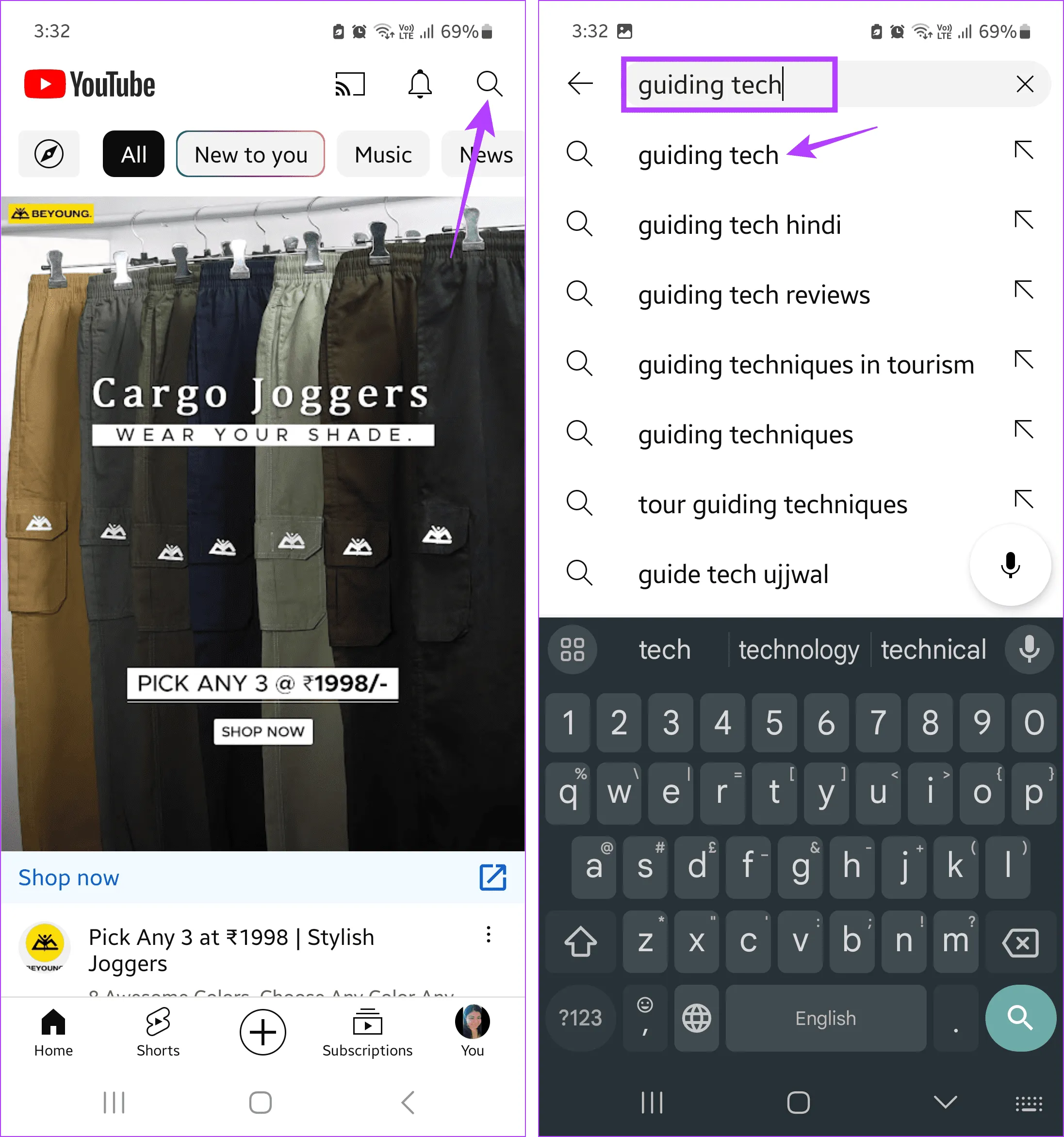 مرحله 1: برنامه موبایل YouTube را باز کنید.در گوشه سمت راست بالا، روی نماد ذره بین ضربه بزنید. مرحله 2: اکنون نام ویدیو یا کانال را در نوار جستجو تایپ کنید.روی نتیجه جستجوی مربوطه ضربه بزنید.