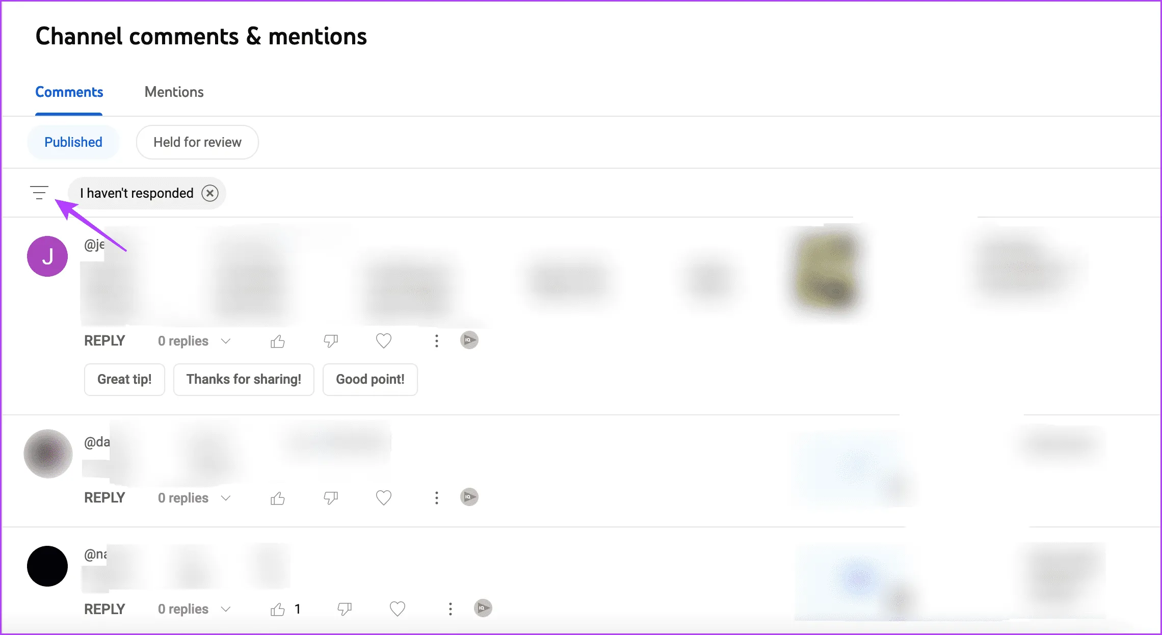 هنگام استفاده از فیلترهای YouTube Studio، میتوانید نظرات YouTube را بر اساس کاربر، ویدیوها، پاسخ ها و غیره مرتب کنید و جستجو کنید.