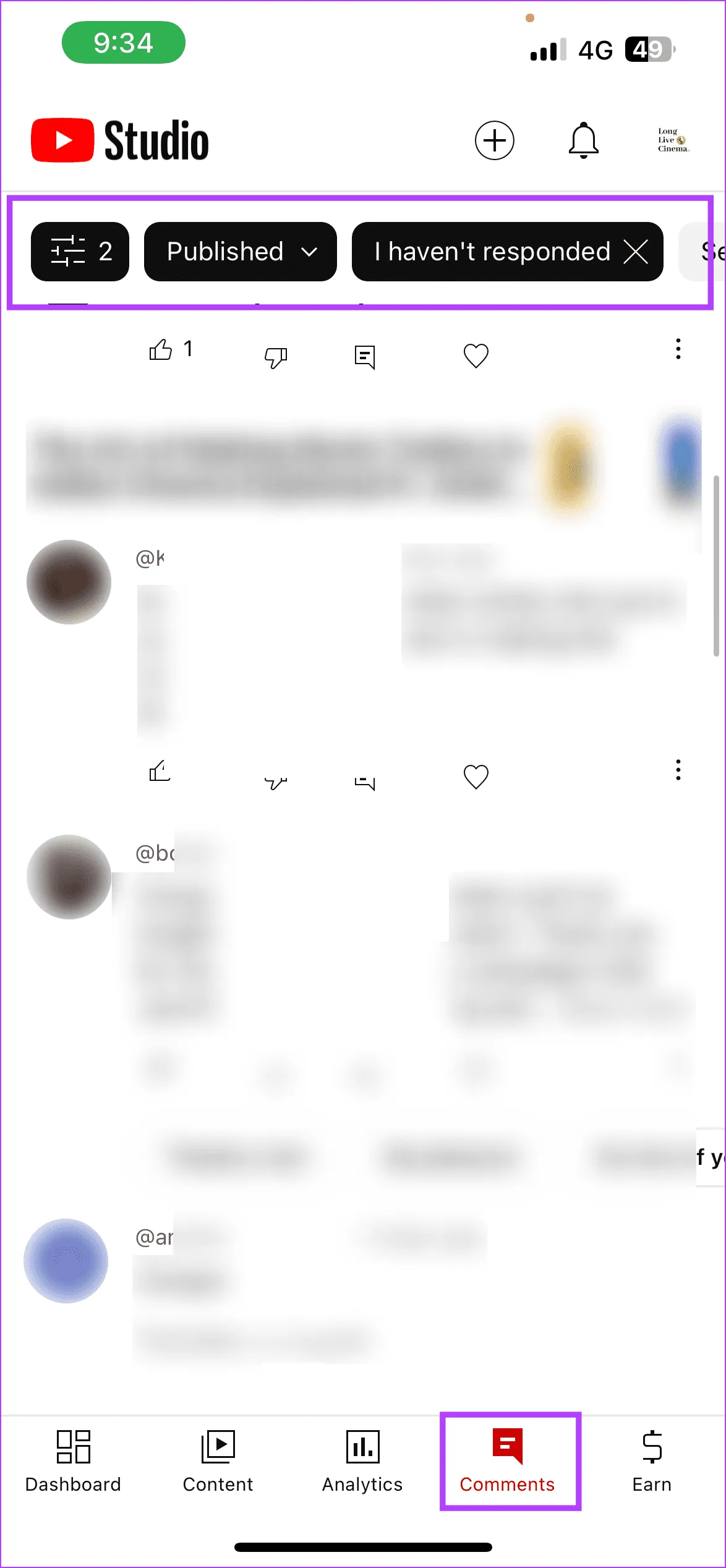مرحله 1: برنامه YouTube Studio را در تلفن همراه خود باز کنید. مرحله 2: از گزینه های منو، روی Comments ضربه بزنید.با این کار باید تمام نظرات روی همه ویدیوهای شما قابل مشاهده باشد. مرحله 3: می توانید در این صفحه پیمایش کنید یا از فیلترها برای یافتن نظر مربوطه در مورد ویدیوی خود استفاده کنید.