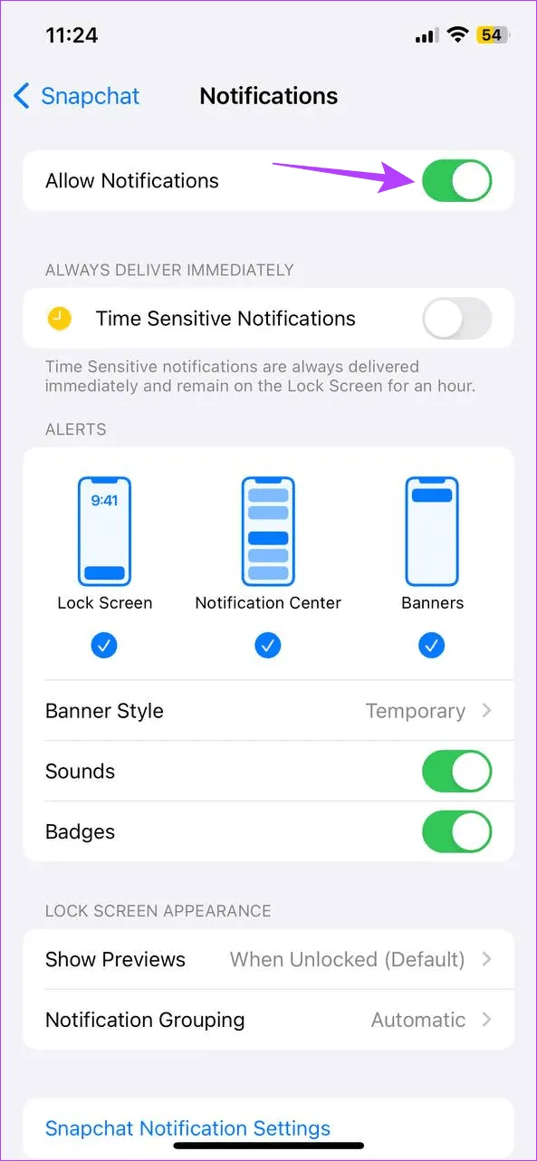 2.با استفاده از تنظیمات اعلان Snapchat.