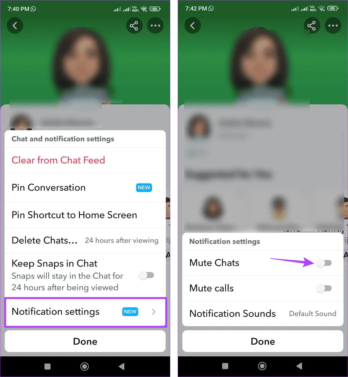 مرحله 4: در اینجا، روی تنظیمات اعلان ضربه بزنید.سپس، ضامن را برای بیصدا کردن چتها روشن کنید.