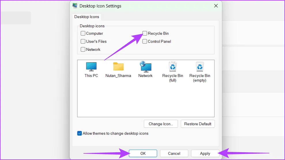 مرحله 2: کادر کنار سطل بازیافت را حذف کنید، روی Apply کلیک کنید و OK را فشار دهید.