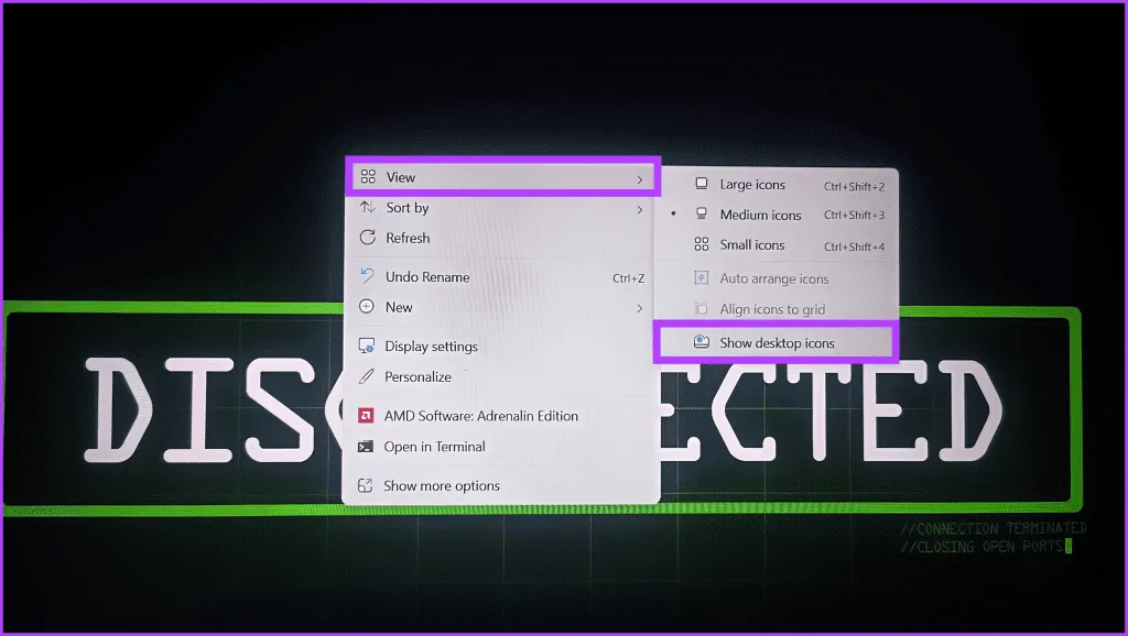پنهان کردن تمام آیکون های برنامه دسکتاپ یک راه ساده برای دستیابی به محیطی بدون درهم و برهم است.علاوه بر این، انجام این کار به منظور حذف سطل بازیافت از دسکتاپ نیز انجام می شود.اگرچه ممکن است سریع ترین روش برای انجام این کار نباشد، اما می تواند تمرکز شما را افزایش داده و زیبایی فضای کاری شما را بهبود بخشد.مراحل زیر را برای مخفی کردن تمام نمادها در پنجره دسکتاپ خود دنبال کنید: مرحله 1: روی یک فضای خالی در صفحه دسکتاپ خود کلیک راست کنید. مرحله 2: نشانگر را روی View در منوی زمینه نگه دارید. مرحله 3: تیک گزینه Show desktop icons را بردارید.