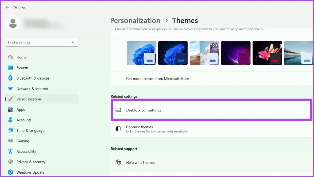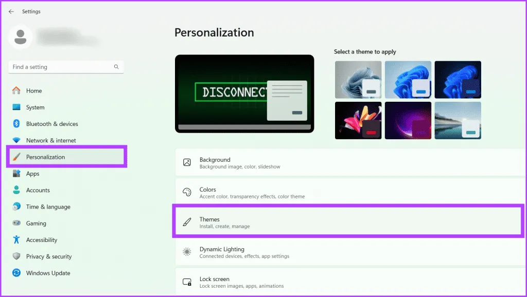 برنامه تنظیمات دروازه ای برای گزینه های مختلف سفارشی سازی در دستگاه ویندوز شما است.از جمله این ویژگی ها می توان به حذف سطل بازیافت از پنجره دسکتاپ اشاره کرد.برخلاف نسخه قبلی خود در ویندوز 11، مایکروسافت تنظیمات را دوباره سازماندهی کرده است، که می تواند مکان یابی آنها را در ابتدا تا حدودی چالش برانگیز کند..با این وجود، میتوانید با دنبال کردن این مراحل آن را پیدا کنید: مرحله 1: با فشار دادن Windows I روی صفحه کلید، برنامه تنظیمات را راه اندازی کنید..همچنین بخوانید: نحوه باز کردن برنامه تنظیمات در ویندوز 11 مرحله 2: به تب Personalization بروید و Themes را انتخاب کنید.