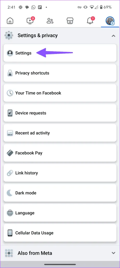 آیا با هشدارهای دوستیابی فیس بوک با مشکلاتی مواجه هستید؟ .در اینجا نحوه.توجه: مراحل برای هر دو سیستم عامل iOS و Android یکسان است. مرحله 1: فیس بوک را باز کنید و به نمایه خود بروید. مرحله 2: تنظیمات و حریم خصوصی را باز کنید و روی تنظیمات ضربه بزنید.