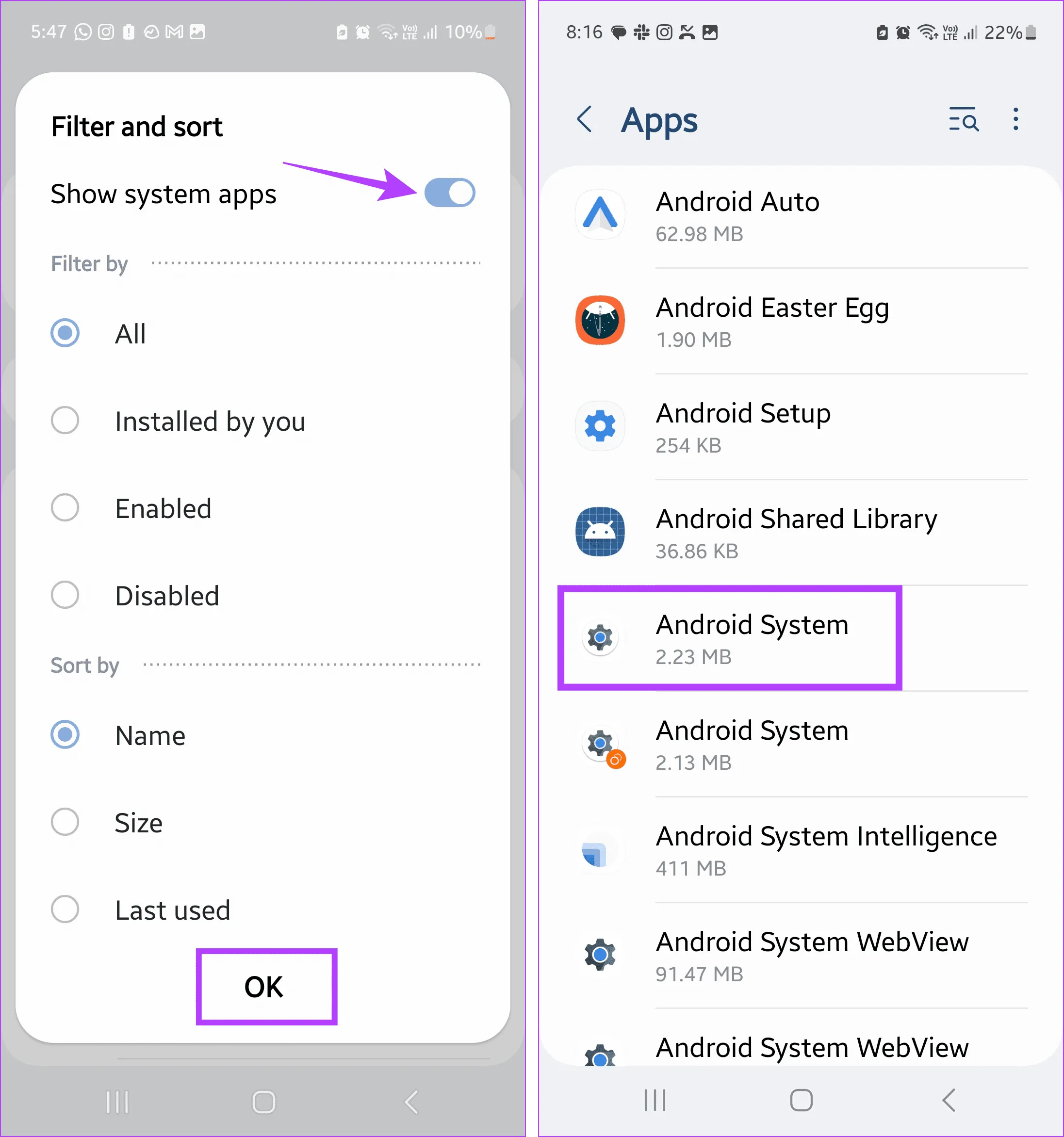 مرحله 3: گزینه Show system apps را فعال کنید و روی OK ضربه بزنید. مرحله 4: سپس به پایین بروید و روی سیستم Android ضربه بزنید.