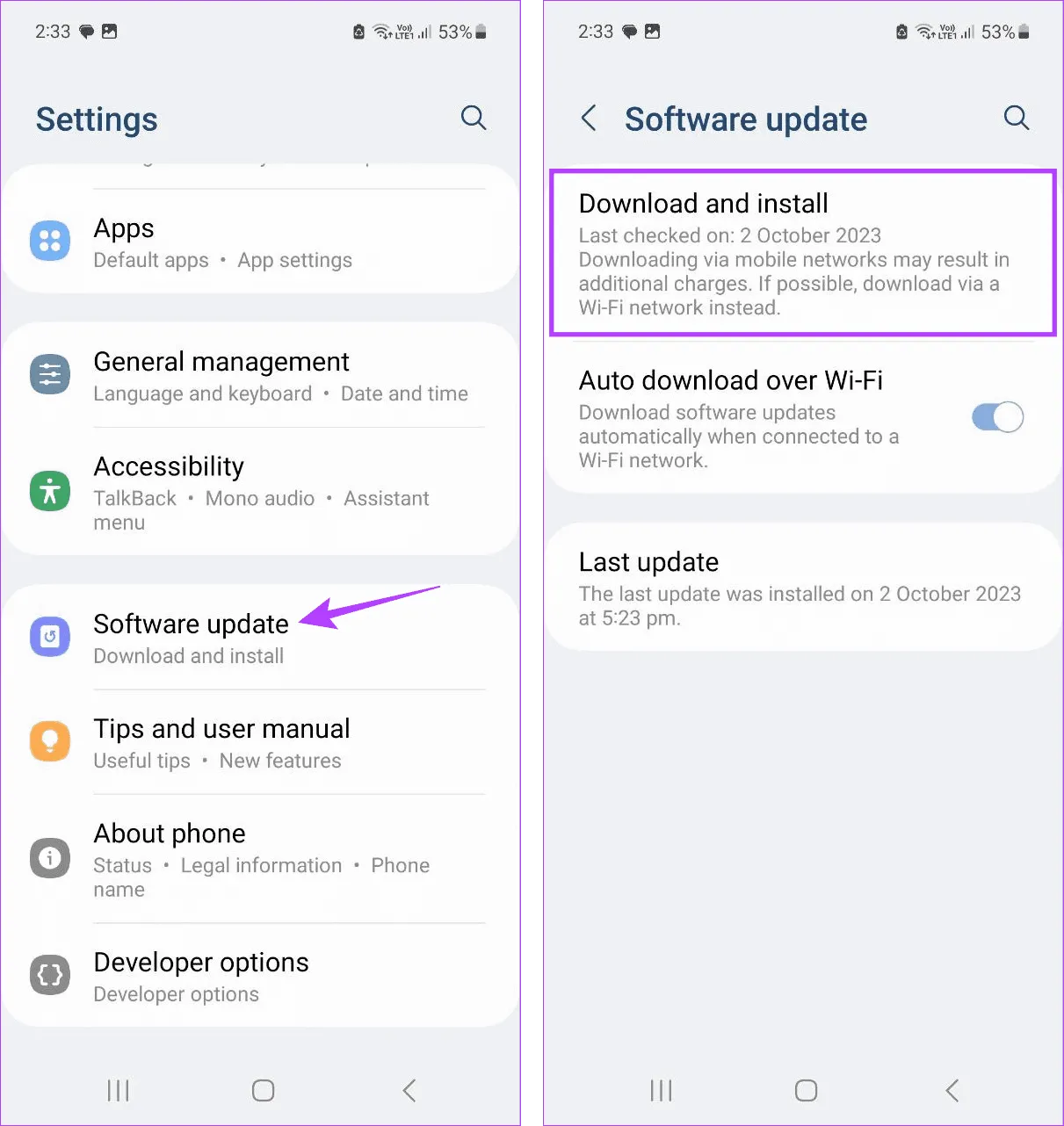 اگر بعد از آخرین بروزرسانی نرم افزار یا پس از بروزرسانی دستگاه سامسونگ خود به آخرین نسخه رابط کاربری، خطای تشخیص رطوبت را مشاهده کردهاید،مراحل زیر را برای دانلود و نصب به روز رسانی نرم افزار بر روی دستگاه Samsung Galaxy خود دنبال کنید. مرحله 1: تنظیمات را باز کنید و روی بروزرسانی نرمافزار ضربه بزنید. مرحله 2: روی دانلود و نصب ضربه بزنید.