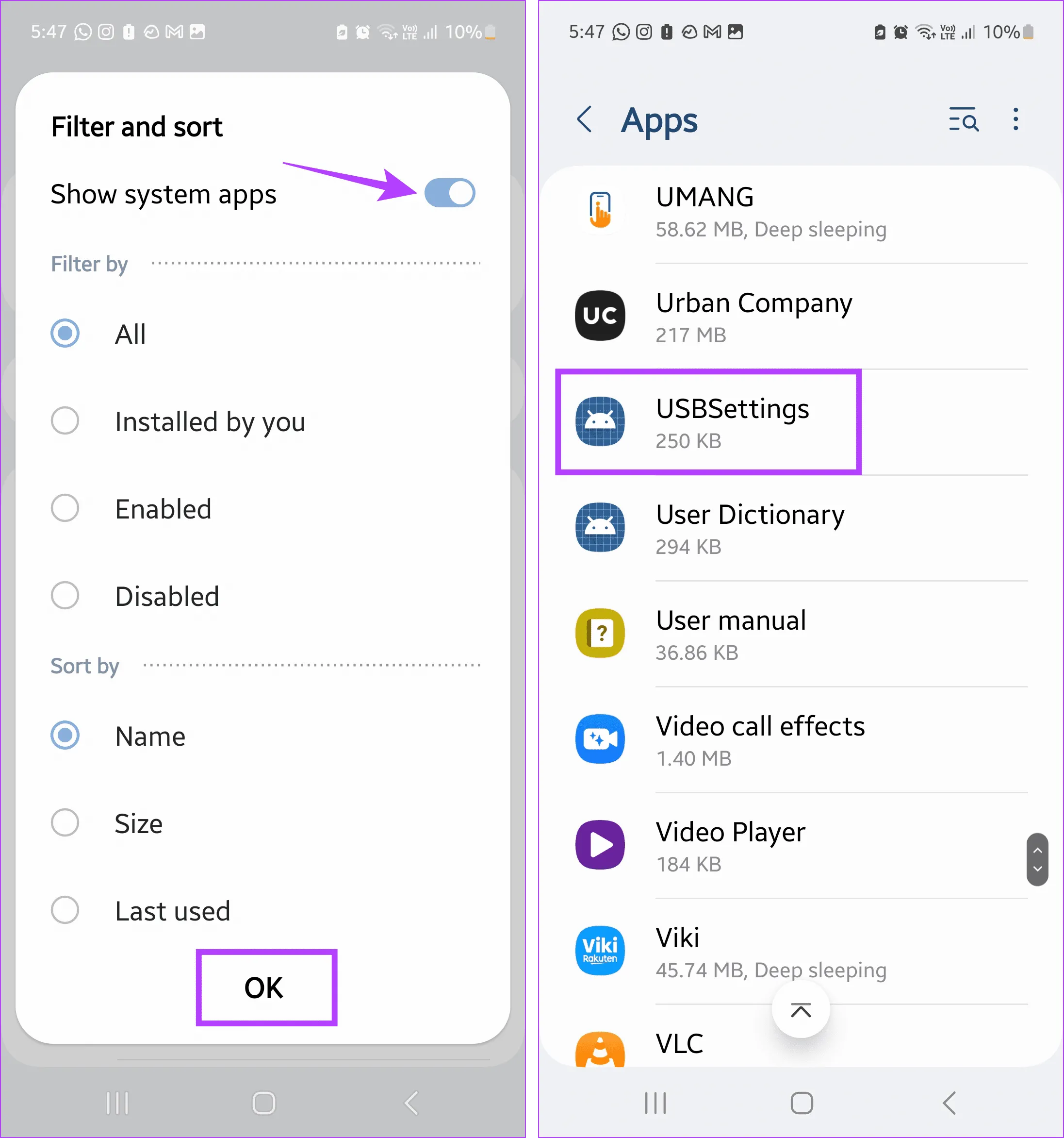 مرحله 3: کلید نمایش برنامه های سیستم را روشن کنید و روی OK ضربه بزنید. مرحله 4: پس از اتمام، روی USBSettings ضربه بزنید.