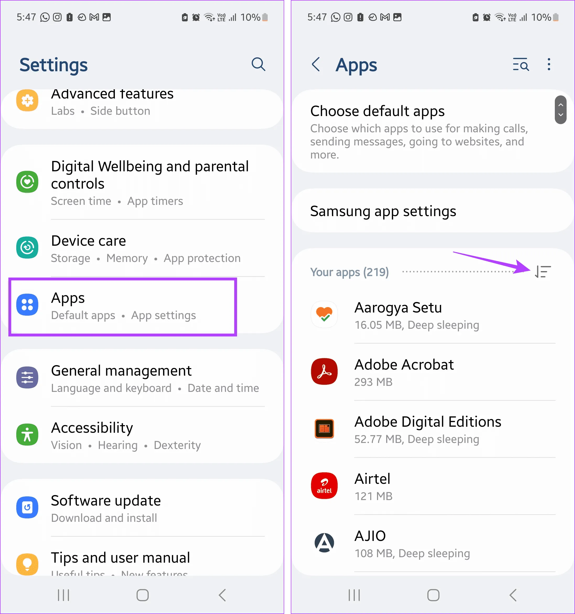 همانطور که گفته شد، اعلان تشخیص رطوبت ممکن است حتی پس از خشک شدن درگاه USB از بین نرود.بنابراین، شما باید به دستگاه خود نگاه کنید.برای انجام این کار، با پاک کردن حافظه پنهان دستگاه سامسونگ خود شروع کنید.با این کار هر فایل حافظه پنهان فاسد پاک می شود و باعث می شود که این خطا به طور مکرر ظاهر شود. مرحله 1: برنامه تنظیمات را باز کنید و روی Apps ضربه بزنید. مرحله 2: روی نماد فیلتر و مرتب سازی ضربه بزنید.