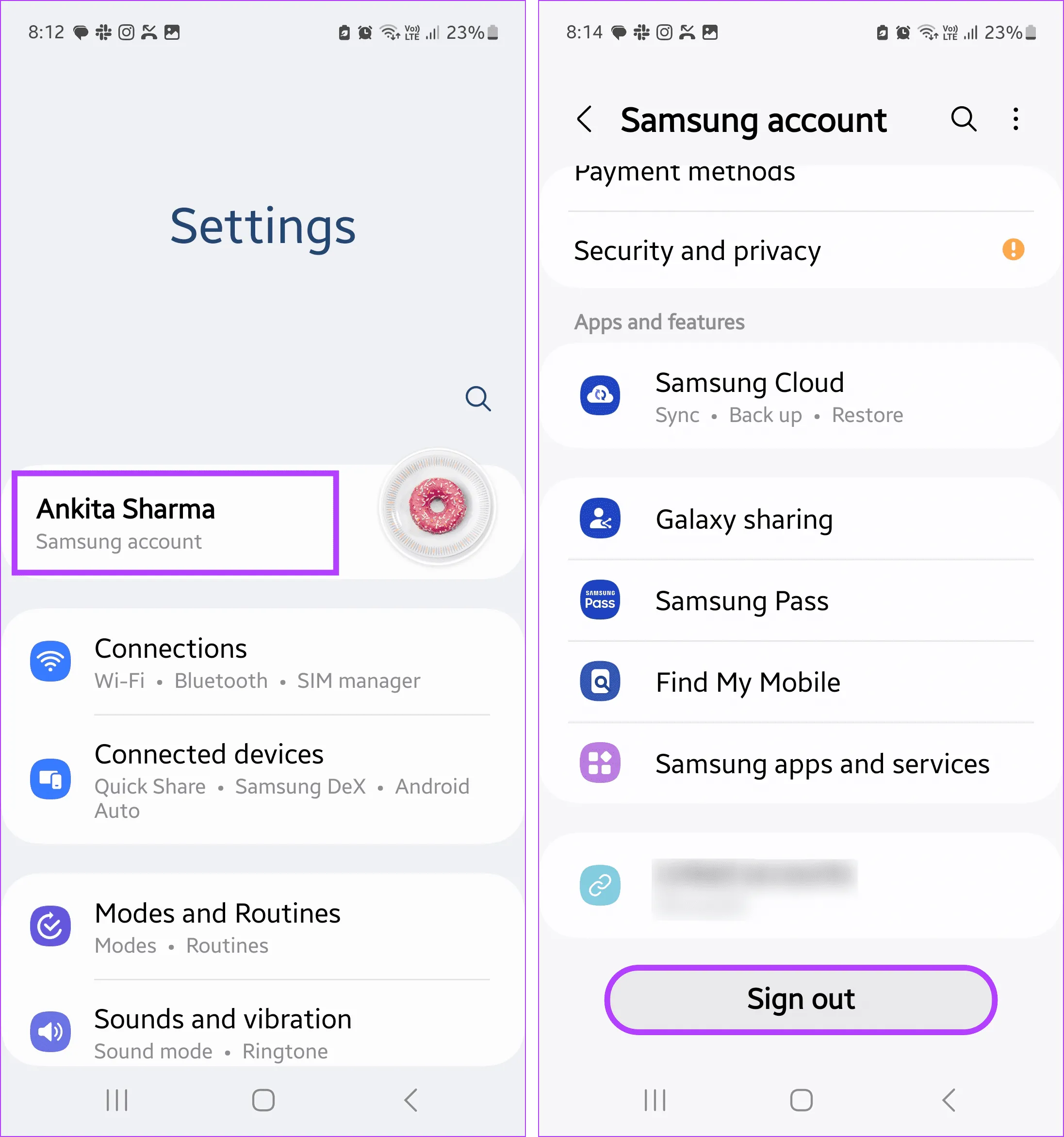 در صورتی که خطای تشخیص رطوبت به حساب سامسونگ شما متصل شود، خروج از سیستم و بازگشت مجدد باید در دستگاه Samsung Galaxy شما از شر آن خلاص شود.این نه تنها جزئیات حساب شما را تازه می کند، بلکه هرگونه خطای قبلی مربوط به همگام سازی حساب را نیز حذف می کند مرحله 1: تنظیمات را باز کنید و روی نام حساب خود ضربه بزنید. مرحله 2: به پایین اسکرول کنید و روی Sign out ضربه بزنید.