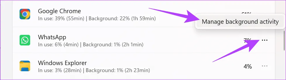 مرحله 3: روی نماد سه نقطه در کنار برنامه ای که بیشترین انرژی را مصرف می کند کلیک کنید و انتخاب کنید.