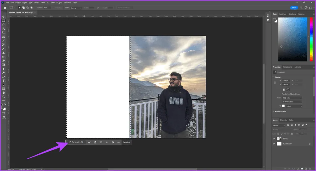 در اصل، هم Generative Expand و هم Generate Fill از یک فناوری برای گسترش تصاویر شما استفاده می کنند.با این حال، تفاوت آنها این است که Generative Expand زمانی که روی یک تصویر پس زمینه استفاده میشود، بهترین عملکرد را دارد.در مورد Generative Fill، اگر شما بتوانید به کارتان بیاید.توجه: Generative Fill فقط در Adobe Photoshop نسخه 25 موجود است.و بالاتر مرحله 1: تصویر خود را در Adobe Photoshop باز کنید.اکنون از ابزار انتخاب برای انتخاب ناحیه خالی روی بوم استفاده کنید. مرحله 2: سپس، را انتخاب کنید.