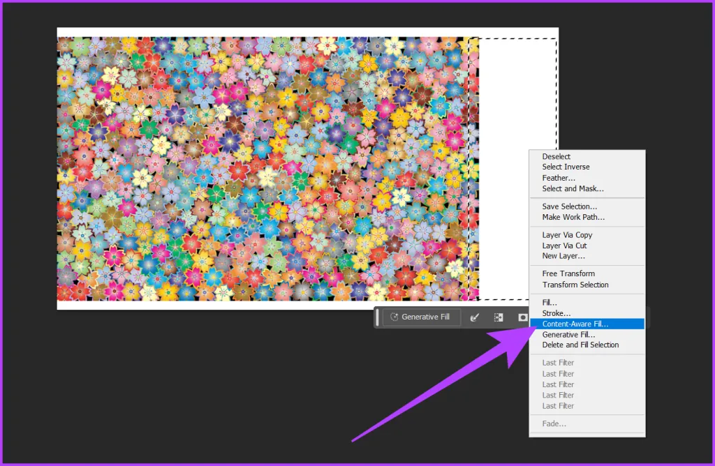 مرحله 2: به منوی Edit رفته و Content-Aware Fill را انتخاب کنید.یا در قسمت انتخاب شده راست کلیک کرده و روی Content-Aware Fill کلیک کنید.