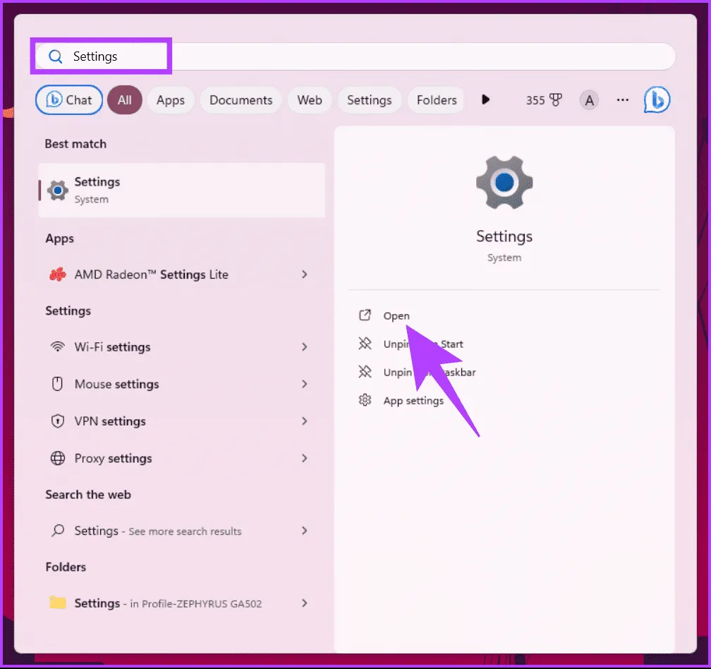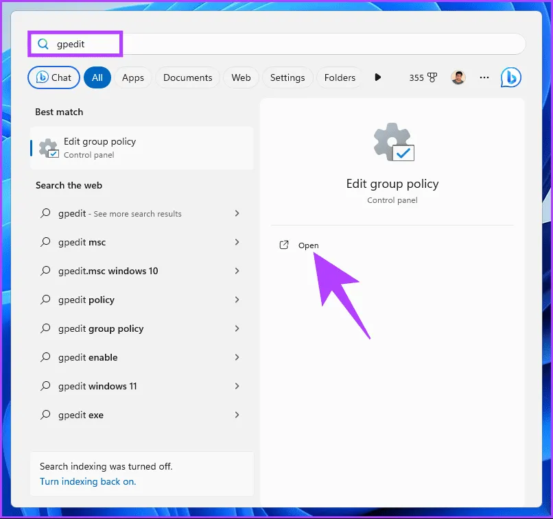 Local Group Policy Editor به شما کمک می کند ویندوز را کنترل کنید.این شامل حذف گروه بندی موارد نوار وظیفه در ویندوز 11 نیز می شود.با این حال، ویرایشگر خط مشی گروه فقط برای در دسترس است.دستورالعمل های زیر را دنبال کنید.توجه: اگر از نسخه خانگی ویندوز 11 استفاده می کنید، می توانید از این روش صرف نظر کنید.اگر نسخه ویندوز خود را نمی دانید، آن را بخوانید. مرحله ۱: کلید Windows را روی صفحهکلید فشار دهید، gpedit را تایپ کنید و روی Open کلیک کنید.برای باز کردن تنظیمات در ویندوز، میتوانید میانبر صفحه کلید Windows I را فشار دهید.