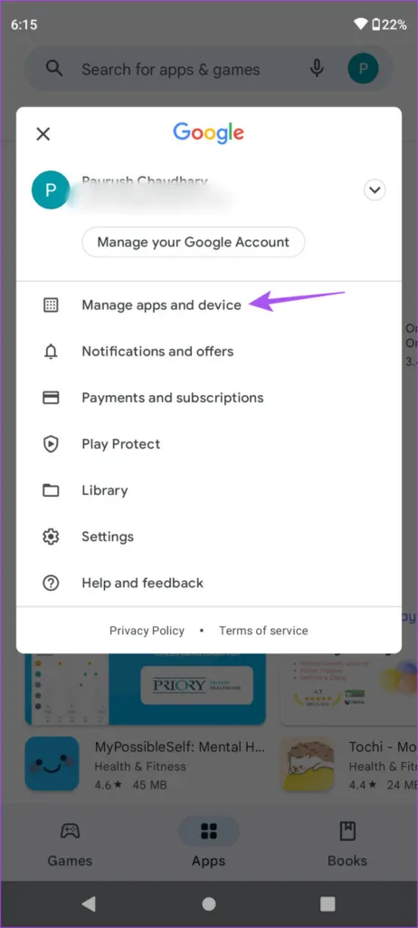 مرحله 2: از لیست گزینه ها، Manage Apps and Device را انتخاب کنید.