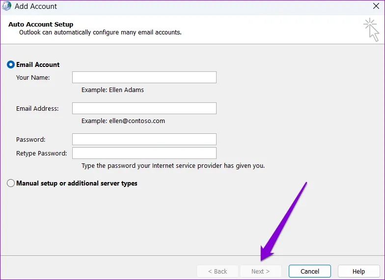 مرحله 5: در پنجره افزودن حساب، مشخصات حساب خود را وارد کرده و روی Next کلیک کنید.