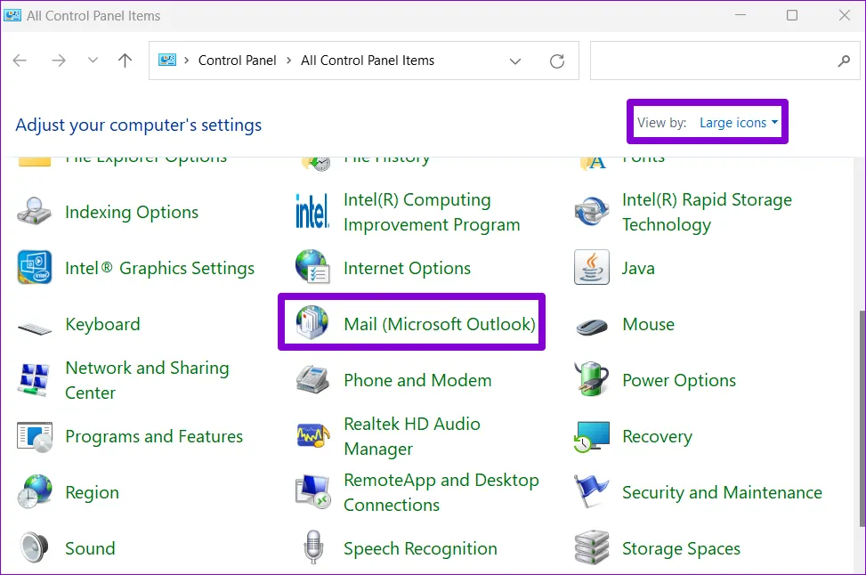 مرحله 2: روی منوی نوع View در گوشه سمت راست بالا کلیک کنید تا نمادهای بزرگ را انتخاب کنید و سپس روی Mail (Microsoft Outlook) کلیک کنید..