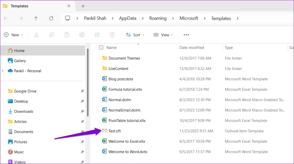مرحله 2: در پوشه Templates، الگوی ایمیل خود را پیدا کرده و دوبار کلیک کنید.اگر قالب این کار را نمی کند.اگر قالب موجود نیست، ممکن است قبلاً آن را از Outlook حذف کرده باشید.