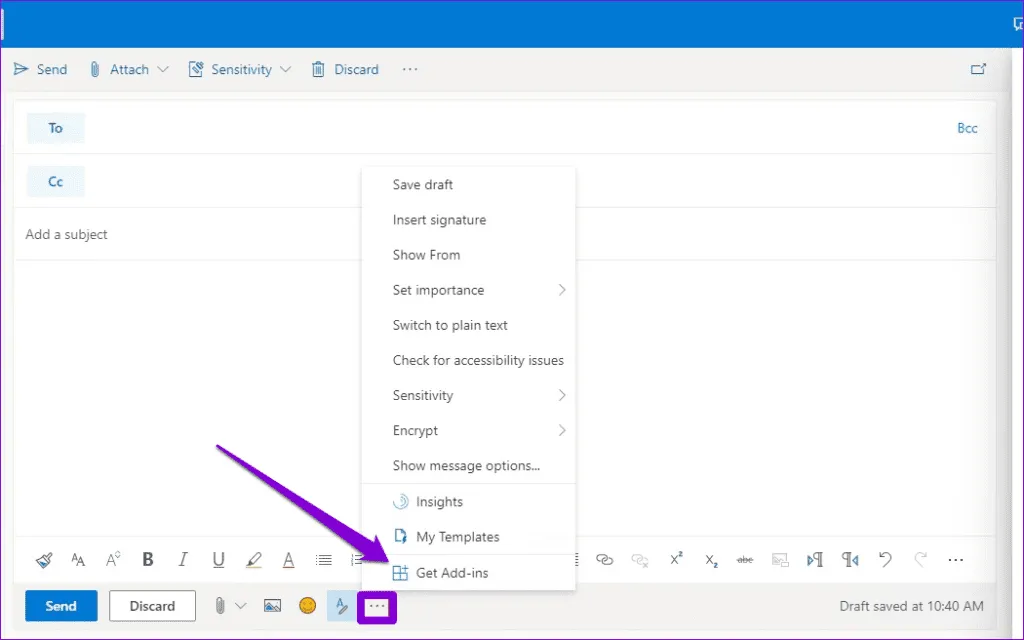 مرحله 3: روی نماد منوی سه نقطه کلیک کرده و Get add-ins را انتخاب کنید.