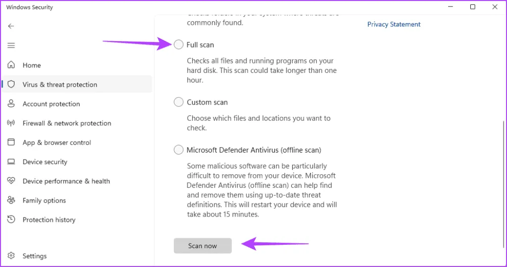 مرحله 3: اسکن کامل را انتخاب کنید، سپس روی دکمه Scan now کلیک کنید تا اسکن اجرا شود.