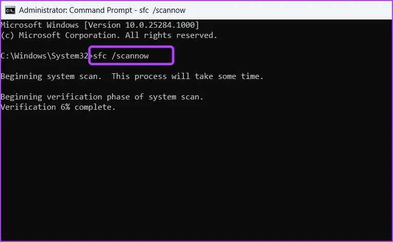 مرحله 3: دستور زیر را تایپ کنید و Enter را بزنید تا اسکن SFC شروع شود: