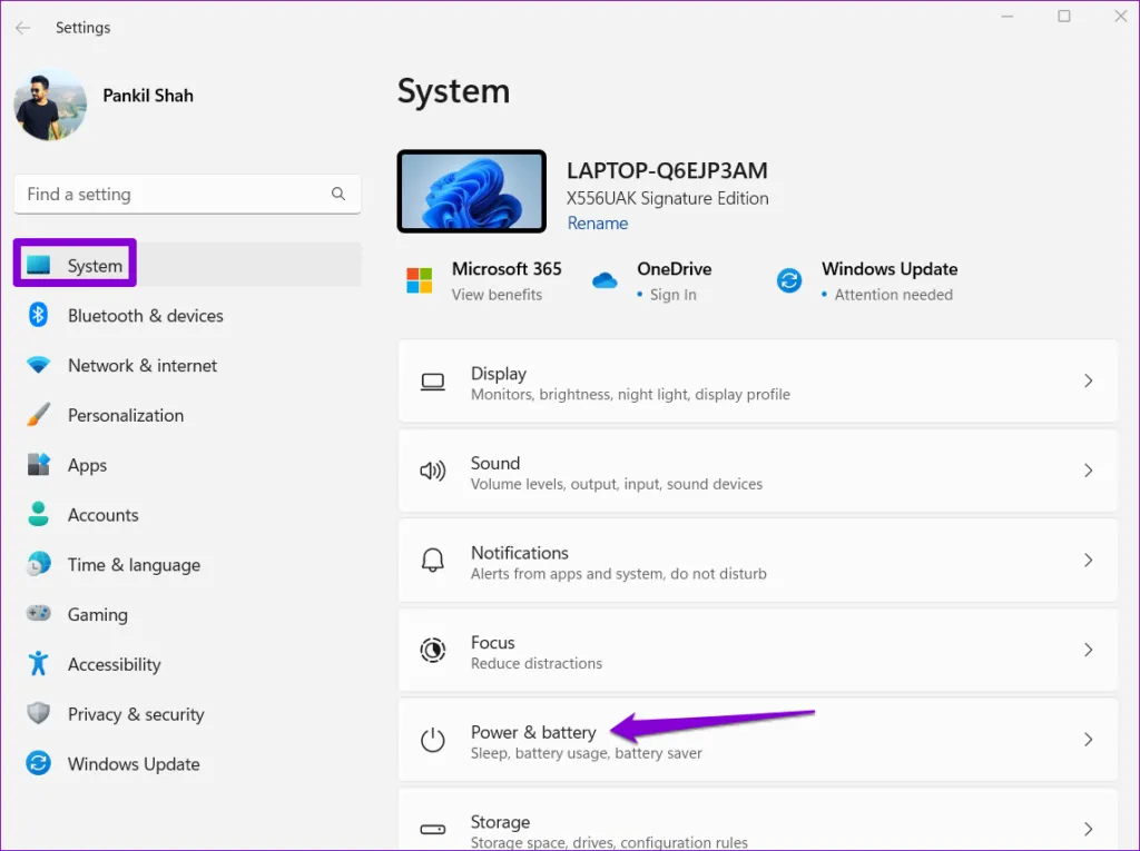 مرحله 2: از منوی سمت چپ روی System کلیک کنید و Power and Battery را انتخاب کنید.
