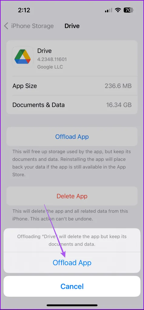 مرحله 3: روی Offload App ضربه بزنید و برای تایید دوباره Offload App را انتخاب کنید.