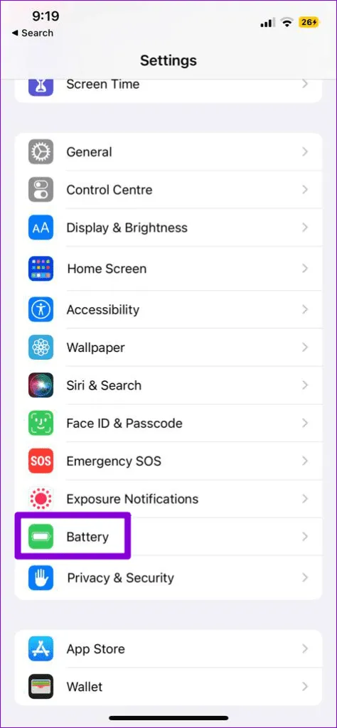 مرحله 1: تنظیمات را باز کنید و روی باتری ضربه بزنید.