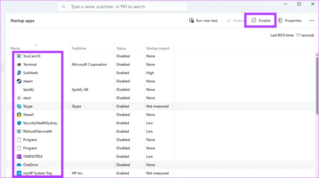 مرحله 4: هر برنامه ای را با وضعیت Enabled انتخاب کنید، سپس روی دکمه Disable کلیک کنید.این کار را برای تعداد زیادی برنامه فعال که ممکن است تکرار کنید، سپس Task Manager را ببندید.