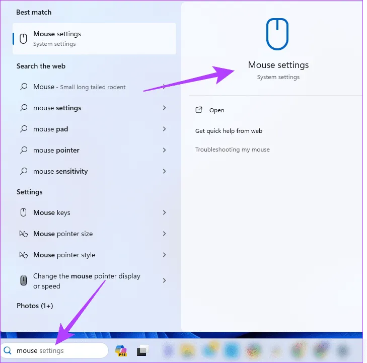 بروز رسانی ویژگی های ماوس یکی از موثرترین راه ها برای رفع مشکل مکان نما است.این به این دلیل است که تنظیمات خاص ماوس ممکن است منجر به سفید شدن مکان نما شود.بنابراین مراحل زیر را برای بروز رسانی آنها دنبال کنید. نشانگرسفیدویندوز11 مرحله 1: روی لنز بزرگنمایی در نوار وظیفه کلیک کنید، ماوس را تایپ کنید و روی گزینه تنظیمات ماوس کلیک کنید..