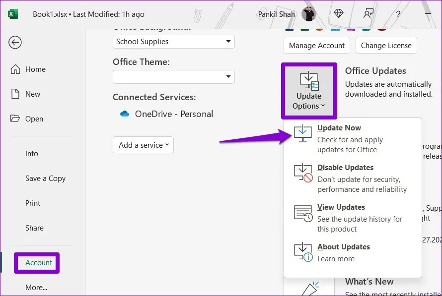 آیا بروز رسانی خودکار برنامه های آفیس را در رایانه شخصی خود خاموش کرده اید؟ .برای بررسی دستی بروزرسانی های ان: مرحله 1: اکسل یا هر برنامه آفیس را در رایانه شخصی خود باز کنید و روی منوی File در گوشه سمت چپ بالا کلیک کنید..