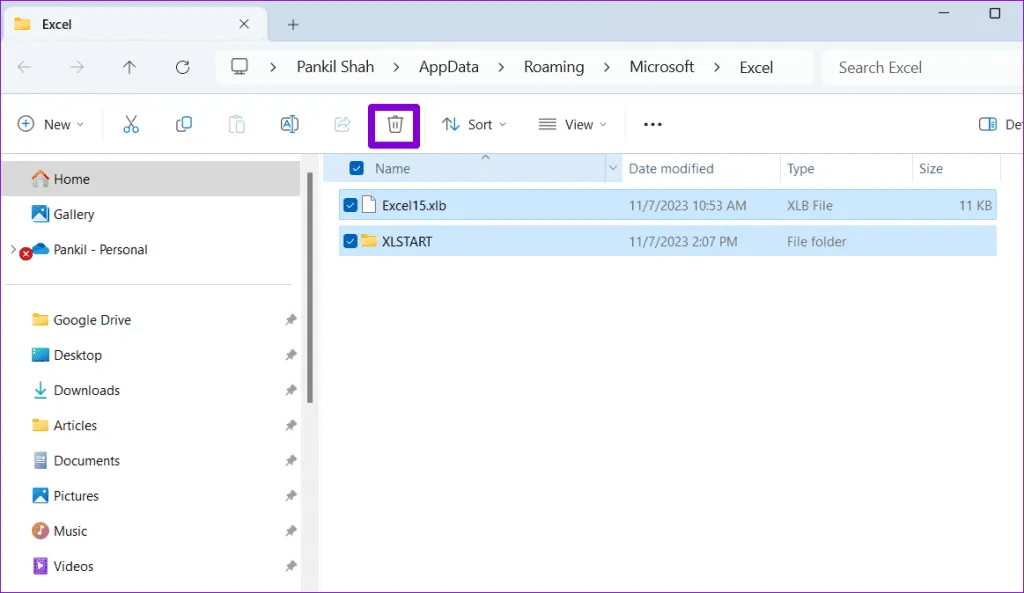 مرحله 2: در پنجره File Explorer، میانبر صفحه کلید Ctrl A را فشار دهید تا همه فایل ها انتخاب شوند و روی نماد سطل زباله در بالا کلیک کنید..