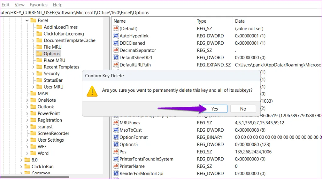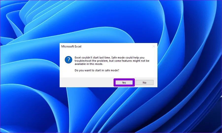 باز کردن مایکروسافت اکسل در حالت ایمن می تواند به شما در رفع انواع خطاها و مشکلات کمک کند.بنابراین، ابتدا آن را امتحان کنید.هنگامی که پیام خطای «اکسل آخرین بار نتوانست شروع به کار کند» ظاهر شد، روی Yes کلیک کنید تا اکسل در حالت امن باز شود..