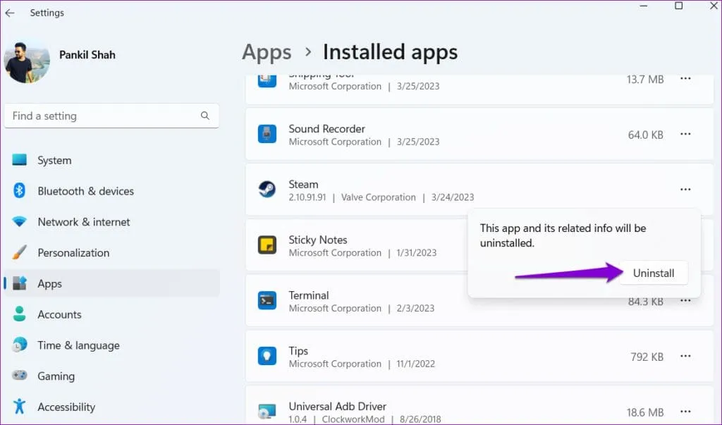 مرحله 2: برنامه Steam را در لیست پیدا کنید، روی نماد منوی سه نقطه افقی در کنار آن کلیک کنید و Uninstall را انتخاب کنید.. عدم نمایش بازی درکتابخانه