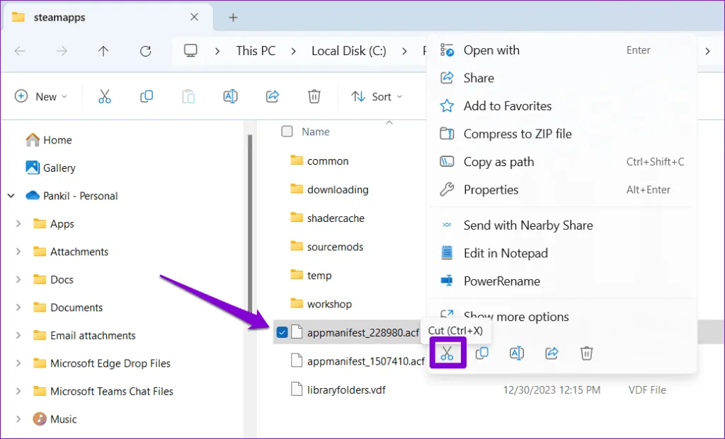 مرحله 4: میانبر صفحه کلید E را فشار دهید تا File Explorer باز شود و به پوشه زیر بروید. مرحله 5: آخرین فایل ACF را پیدا کنید، روی آن کلیک راست کرده و Cut را انتخاب کنید..سپس به دسکتاپ خود بروید و Ctrl V را فشار دهید تا فایل پیست شود.