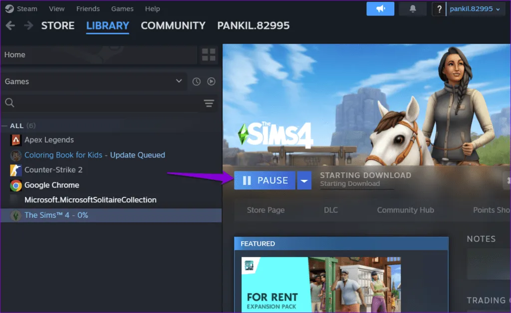 مرحله 2: هنگامی که استیم شروع به دانلود بازی شما کرد، روی دکمه Pause کلیک کنید.