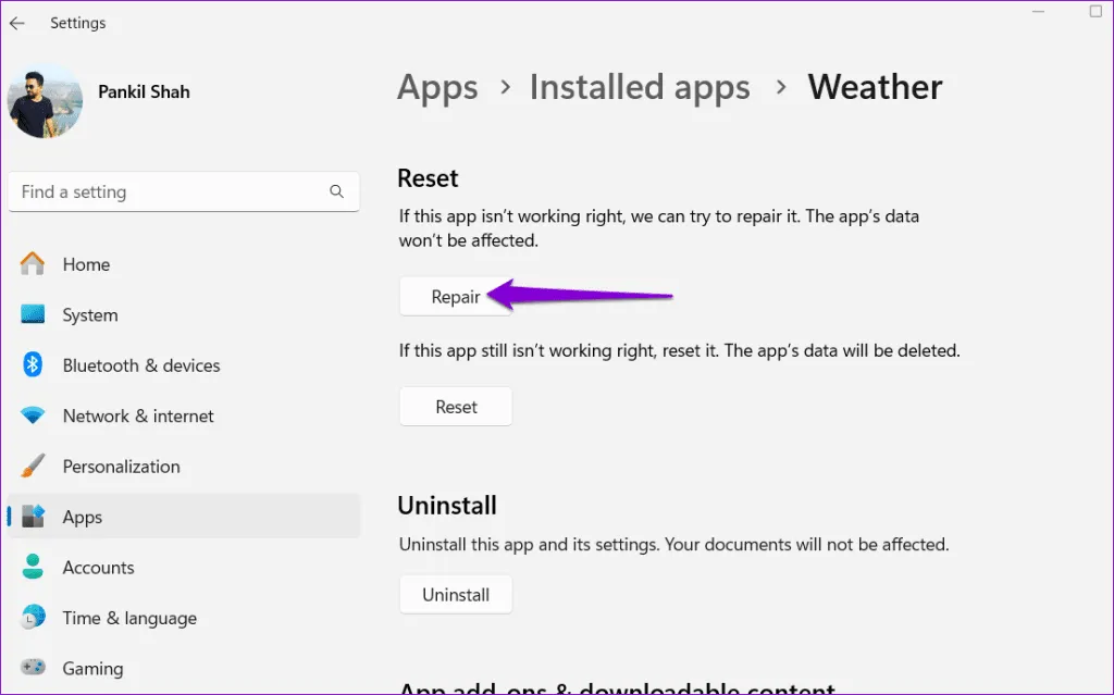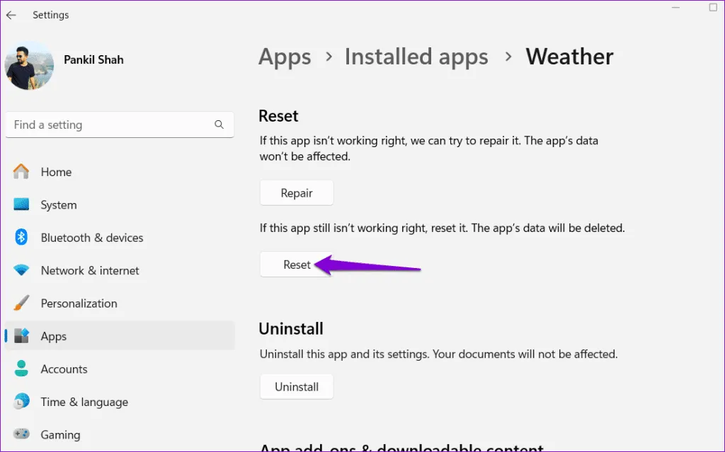 اگر پس از تعمیر برنامه همچنان مشکل باقی می ماند، می توانید با کلیک روی دکمه Repair، برنامه Weather را بازنشانی کنید..با انجام این کار، تمام داده های برنامه پاک می شود و برنامه به تنظیمات پیش فرض خود باز می گردد.پس از آن، شما نباید با هیچ مشکلی با آن مواجه شوید.