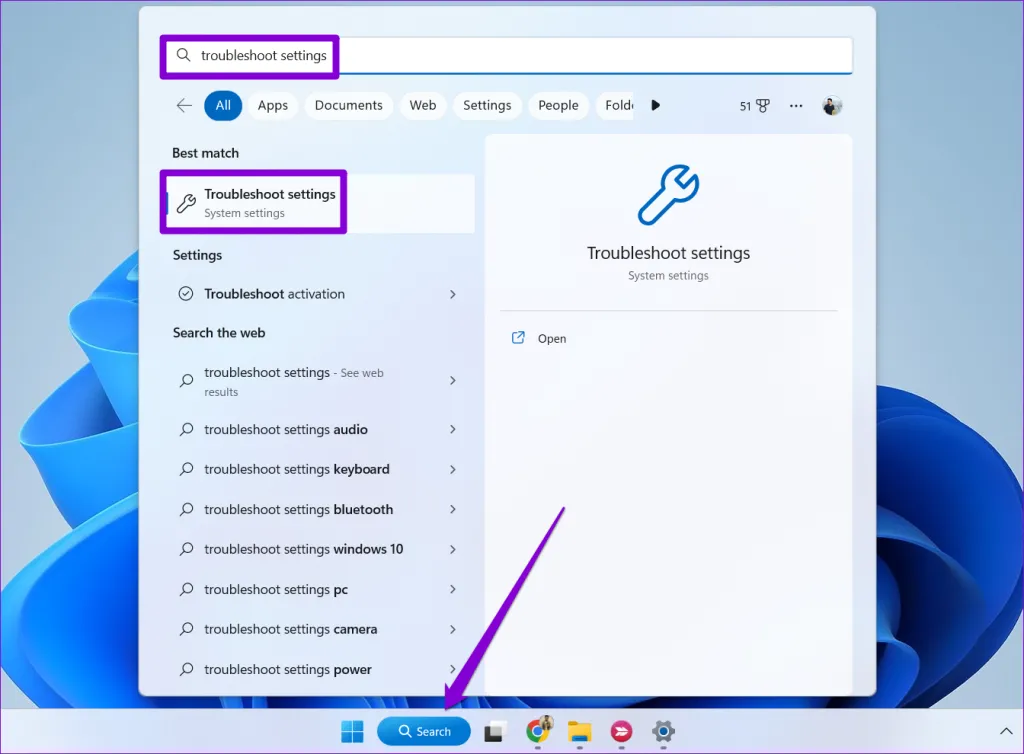 اجرای عیبیاب برنامههای فروشگاه مایکروسافت در ویندوز به طور موثر مشکلات برنامه های پلتفرم جهانی ویندوز (UWP) را برطرف میکند..میتوانید این ابزار را اجرا کنید تا ببینید آیا برنامه MSN Weather دوباره کار میکند یا خیر.برای اجرای عیبیاب Windows Store Apps، از این مراحل استفاده کنید: مرحله 1: روی نماد جستجوی Windows در نوار وظیفه کلیک کنید، تنظیمات عیبیابی را تایپ کنید و اولین نتیجه را که ظاهر میشود انتخاب کنید..