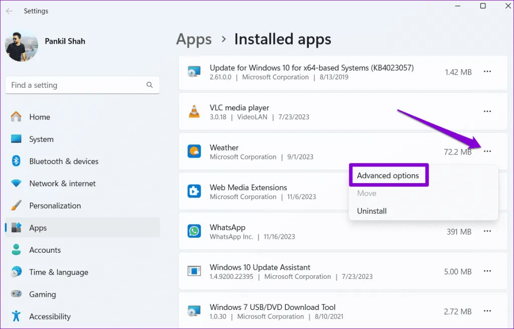 مرحله 2: در لیست اسکرول کنید یا از کادر جستجو برای پیدا کردن برنامه آب و هوا استفاده کنید.روی نماد منوی سه نقطه در کنار آن کلیک کنید و گزینه های پیشرفته را انتخاب کنید.