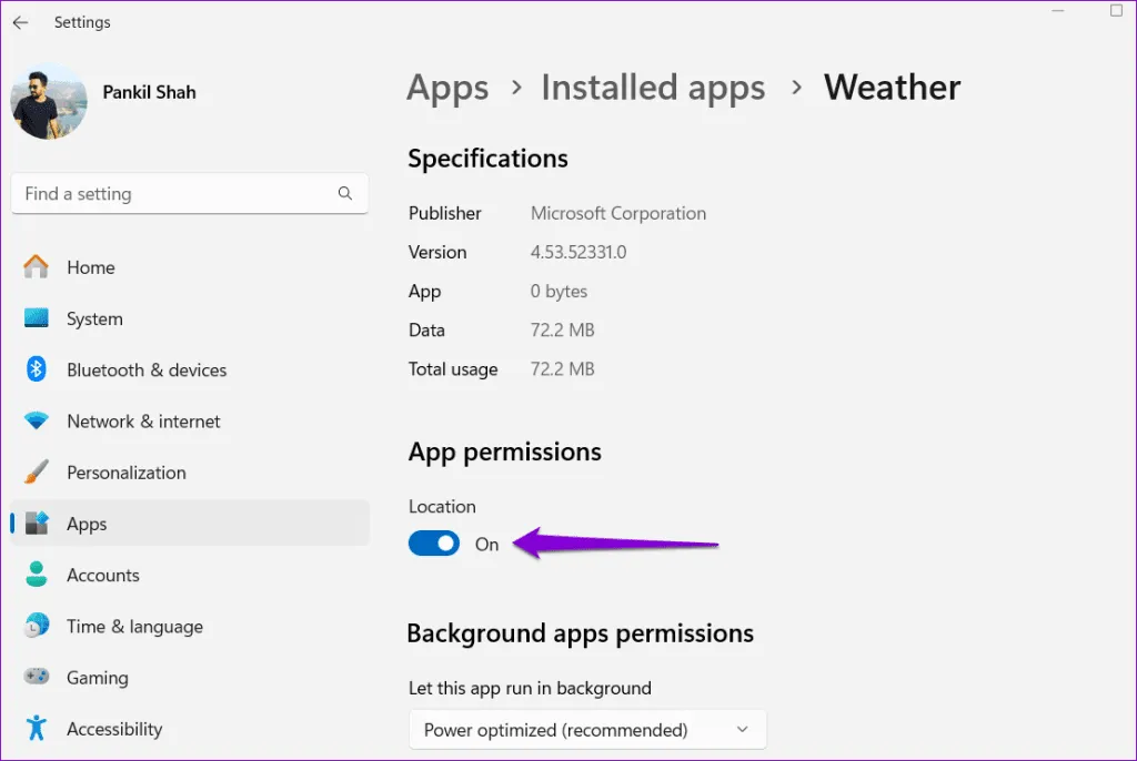 مرحله 2: در قسمت مجوزهای برنامه، کلید کنار موقعیت مکانی را فعال کنید.
