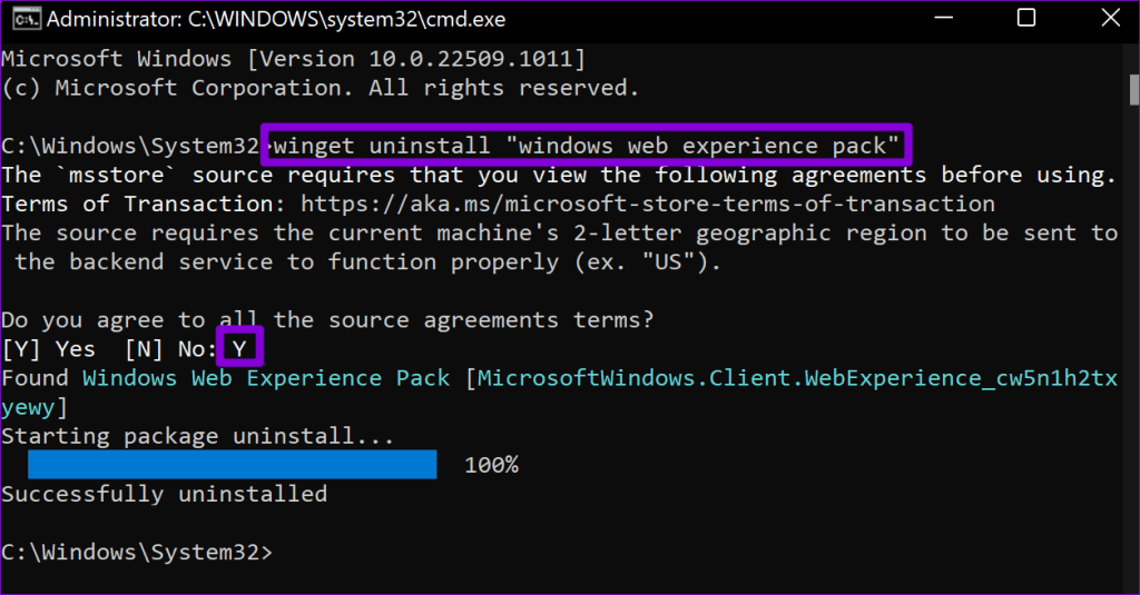 مرحله 3: در کنسول، دستور زیر را جایگذاری کنید و Enter را فشار دهید:مرحله 4: Y را تایپ کرده و Enter را فشار دهید تا با شرایط و ضوابط فروشگاه مایکروسافت موافقت کنید..