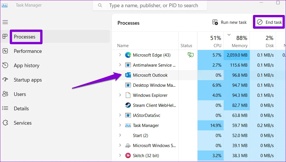 Microsoft Outlook، مانند هر برنامه دیگری، گاهی اوقات ممکن است با مشکلات موقتی مواجه شود که بر عملکرد آن تأثیر می گذارد.اگر فقط یک مشکل یکباره است، راه اندازی مجدد برنامه Outlook باید مشکل شما را حل کند.Ctrl Shift Esc را روی صفحه کلید خود فشار دهید تا Task Manager باز شود.در تب Processes، Microsoft Outlook را انتخاب کرده و روی گزینه End task کلیک کنید.