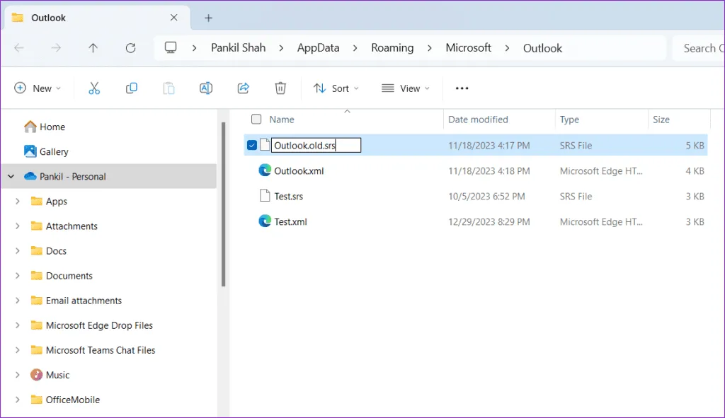 مرحله 2: در پنجره File Explorer، Outlook را انتخاب کنید.فایل srs و نام آن را به Outlook تغییر دهید.قدیمی.srs یا چیزی مشابه.