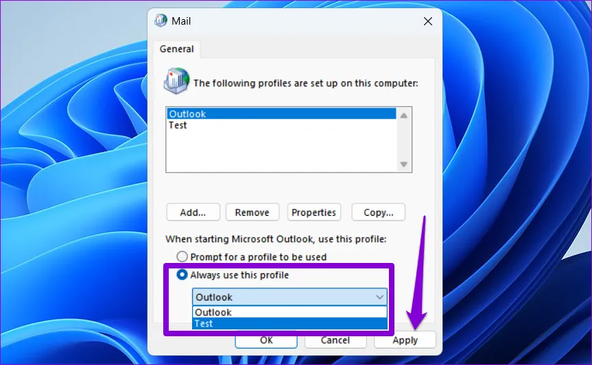 مرحله 6: نمایه جدید خود را با استفاده از منوی کشویی انتخاب کنید و روی Apply کلیک کنید.