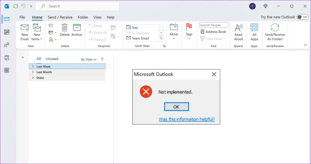 برنامه Outlook را دوباره باز کنید و بررسی کنید که آیا همچنان خطا را نشان می دهد.