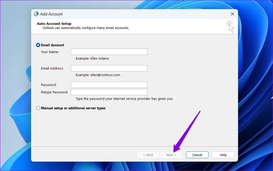 مرحله 5: در پنجره افزودن حساب، مشخصات حساب خود را وارد کرده و Next را بزنید.