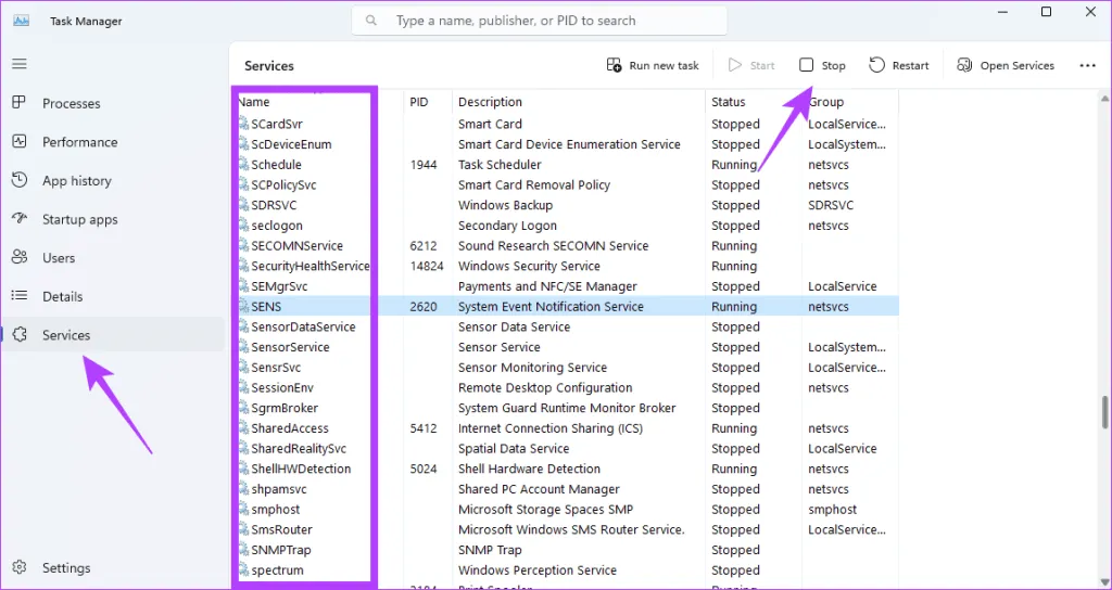 علاوه بر اجرای برنامهها، میتوانید خدمات و فرآیندهای در حال اجرا خود را نیز ببندید.موثرترین راه از طریق Task Manager ویندوز 11 است.وقتی سرویس های در حال اجرا را میبندید، فضایی را برای سرویس های جدید آزاد میکند و ممکن است تضاد بین فرآیندهایی را که باعث ایجاد مشکل میشوند برطرف کند..مراحل زیر را دنبال کنید. خطا Insufficient مرحله 1: میانبر صفحه کلید Ctrl Shift Esc را فشار دهید تا Task Manager باز شود. مرحله 2: روی گزینه Services در سمت راست کلیک کنید، روی سرویسی که می شناسید و در حال حاضر به آن نیاز ندارید کلیک کنید و سپس دکمه Stop را کلیک کنید..